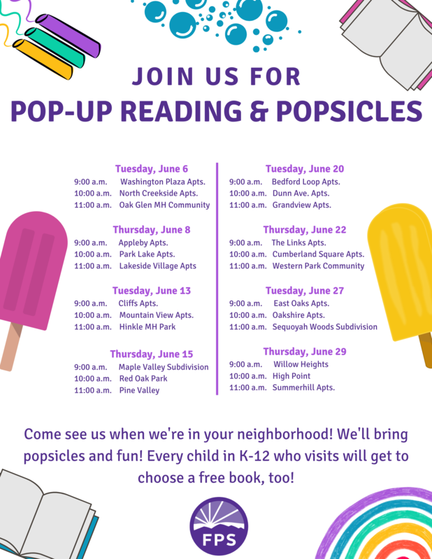 Fayetteville Public Schools is coming to your neighborhood this summer with reading, popsicles, and fun! We would love for you to join us as FPS personnel will bring a special reading program to K-12 students at various locations around town. Students will get a free book when they join us! We can't wait to see you!